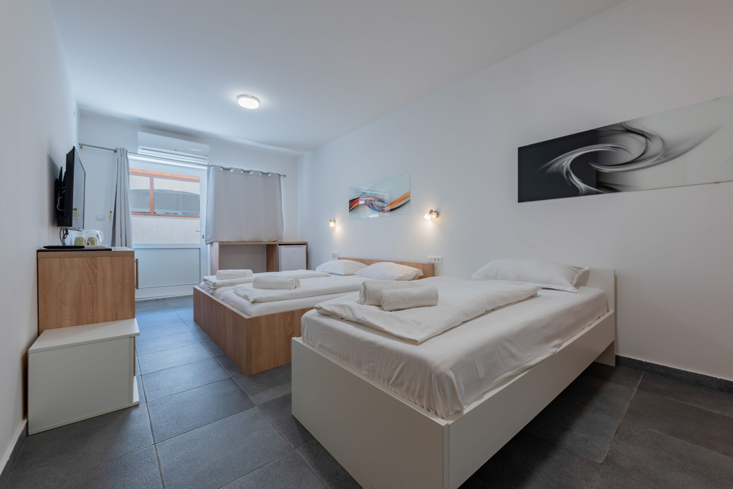 This is a room suitable for 3 people. We have 3 single beds in the room, but we can always turn 2 single beds into one queen-size bed if we have a couple in the room. The room is big enough for 3 people, and at least one crib can be put in the room without taking up too much space. It is good for small families and groups of friends. A small terrace is in front of the room and is almost connected to the restaurant and pool area.