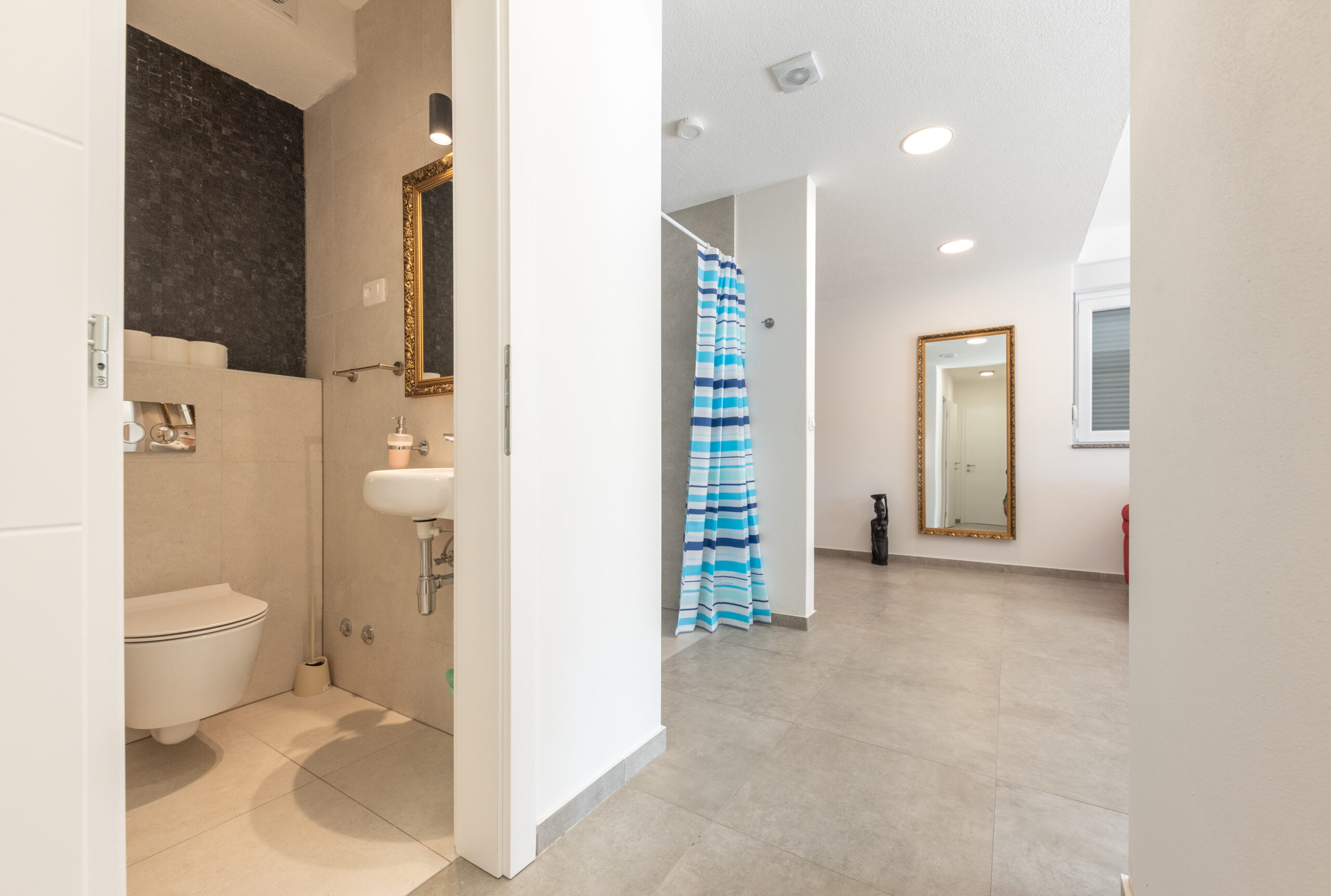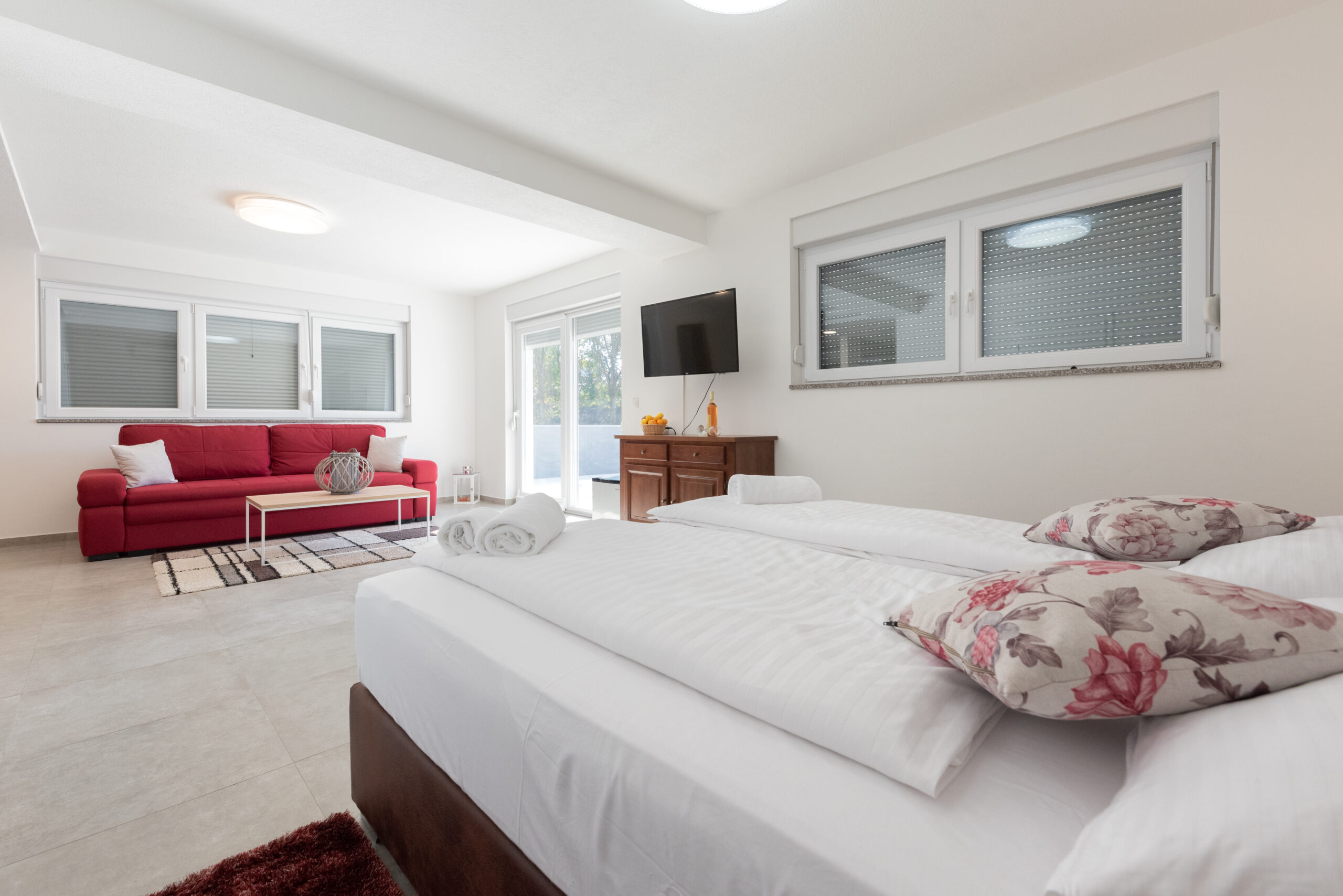 This room is a superior room and is suitable for a couple that wants an extra-large room on the ground floor or for a group of up to 4 people that want to be together in the same room. The room itself has no view but has a private terrace and is located on the entrance of the second hotel building, which is a newly built building that was specifically designed with the hotel guests in mind. It has a fully equipped bathroom with a walk-in shower and floor heating, a hairdryer and free toiletries, a worktable for business travelers, free internet access, a satellite TV and a refrigerator. The room is on the seaside, but it's further away from the pool and the restaurant, which makes it one of the quieter rooms.