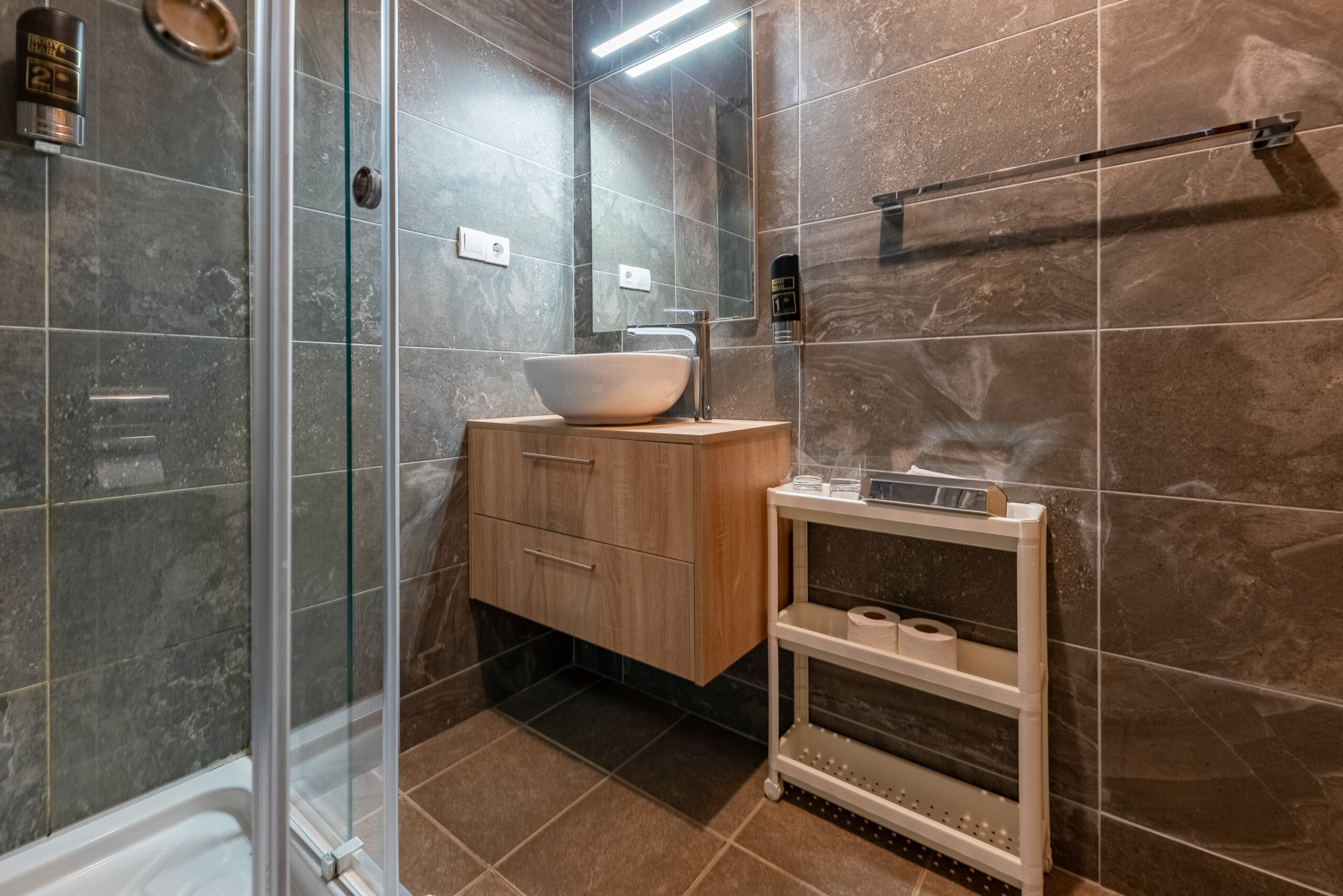 Our studio apartments are smaller than our one-bedroom apartments, but still, they offer plenty of space and enough room for 2 to 4 people. This one is suited for 3 people and has a free internet access, satellite TV, air condition and a full-size bathroom. If you are planning a romantic weekend getaway or just kick back and relax with your family, this is it. It is located on the first floor and overlooks the large forest. You will have your peace and quiet on the balcony of this unit.